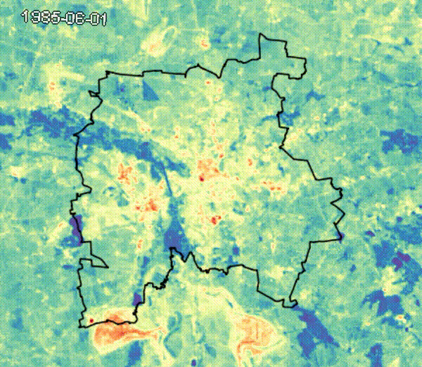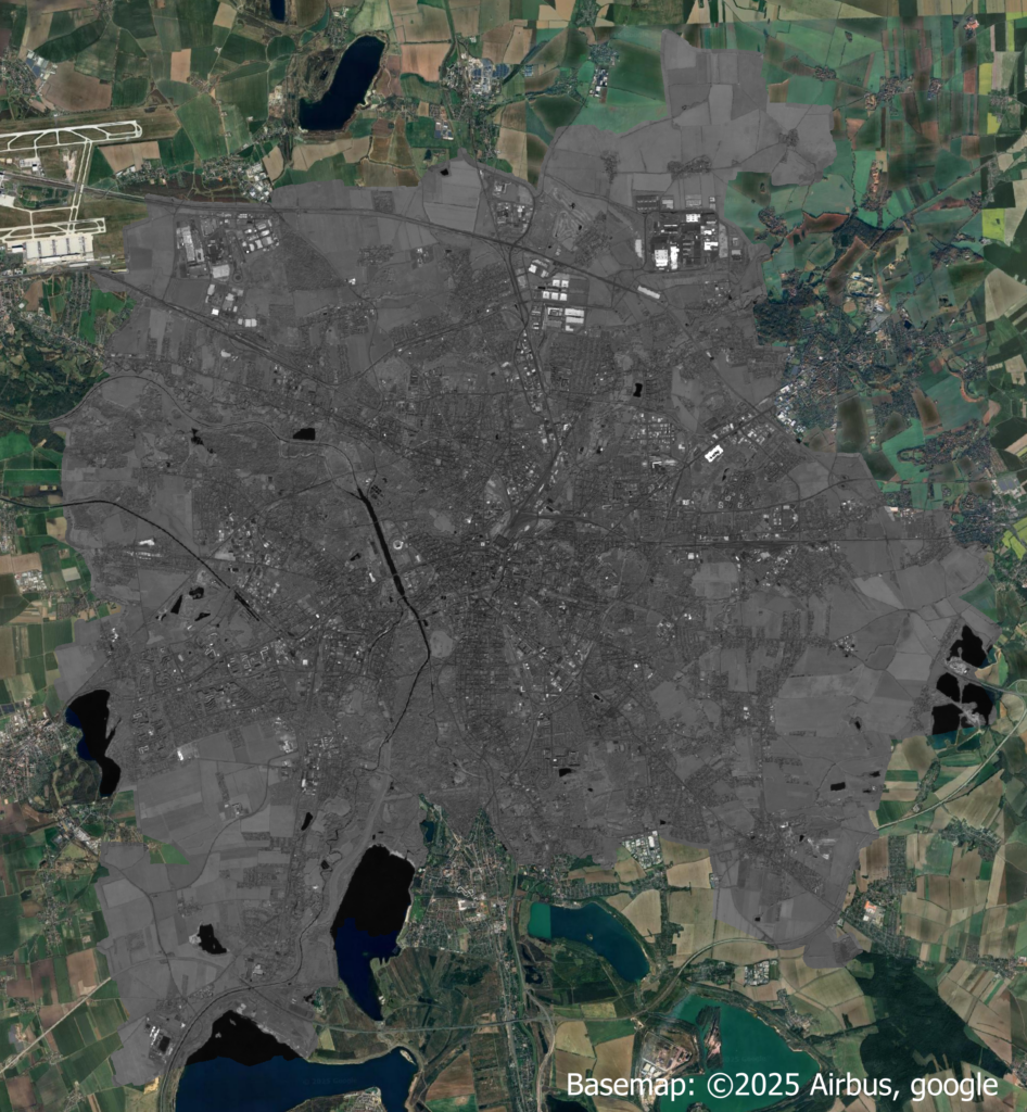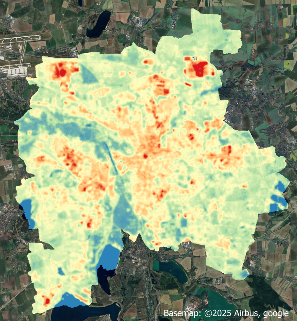 Die Oberflächentemperatur (LST) wird mit Hilfe der thermalen Infrarotsensoren (TIRS) der Landsat-Satelliten abgeleitet. Die Oberflächentemperatur (LST) hat einen signifikanten Einfluss auf die gefühlte Temperatur. Die bereitgestellten Werte entsprechen einem langjährigen Sommer-Tages-Mittelwert.