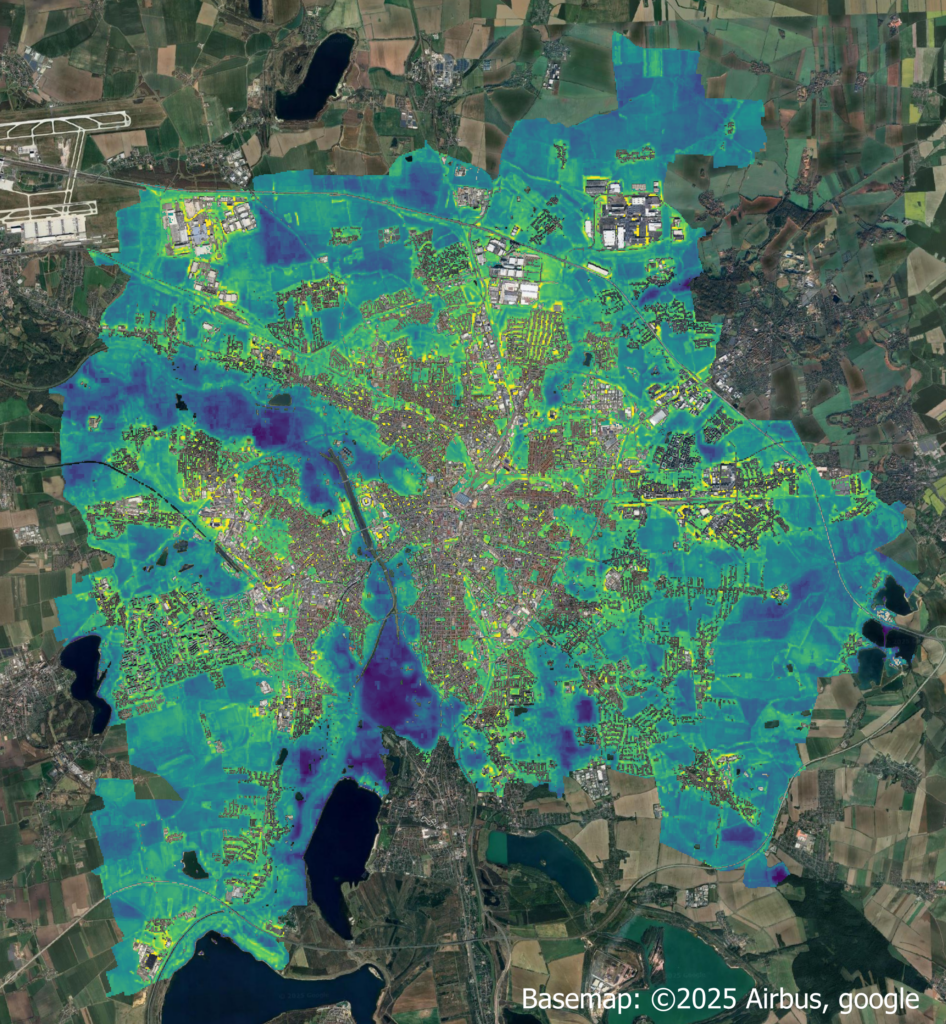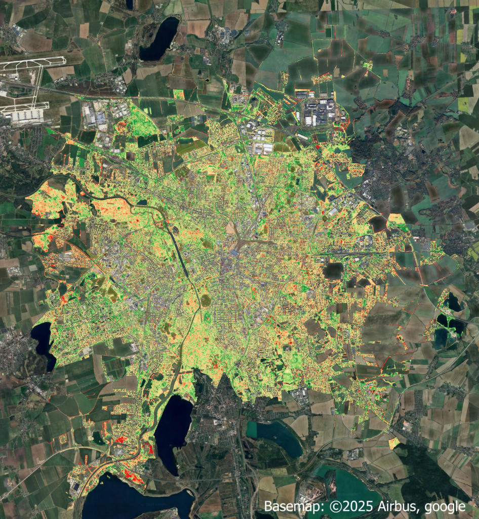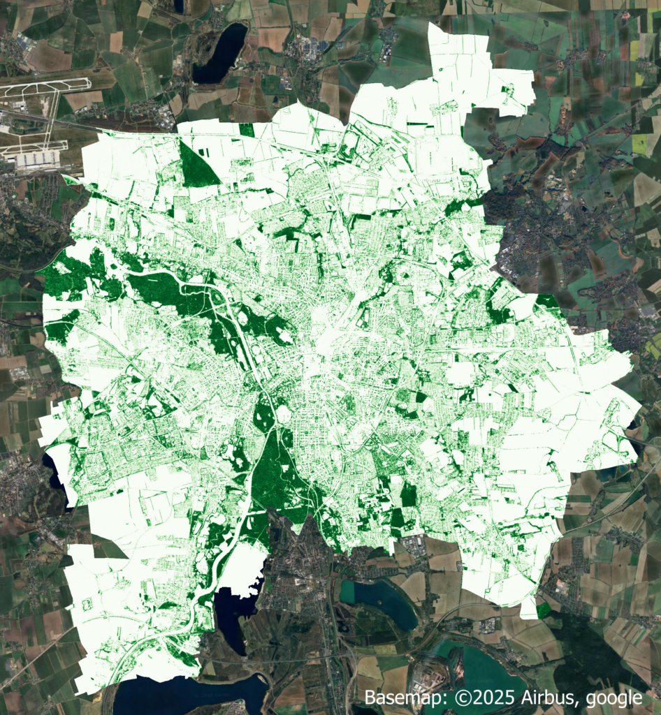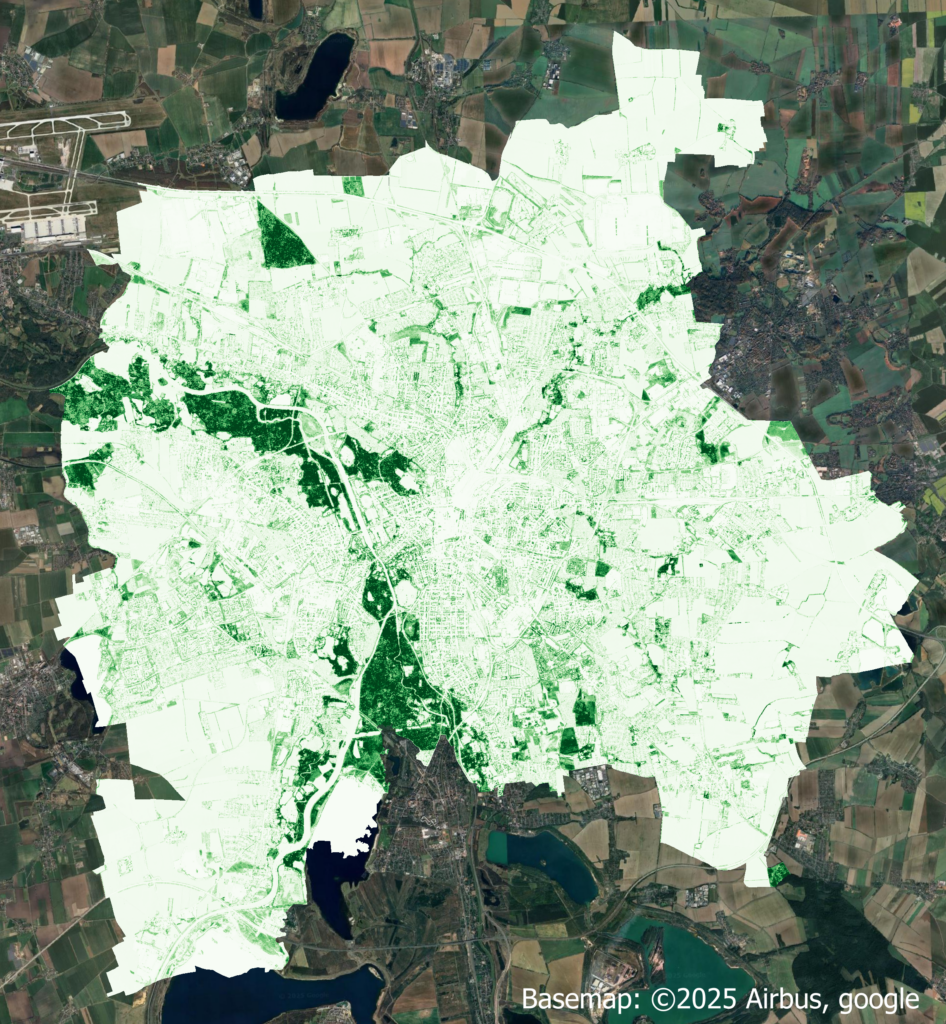Das Grünvolumen gibt an wie viel Vegetation in unseren urbanen Gebieten vorhanden ist. Es trägt maßgeblich zur Kühlleistung und Luftverbesserung bei und kann mit den frei verfügbaren Satellitendaten des Copernicus Programms flächendeckend und zeitaktuell abgeleitet werden.
